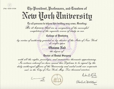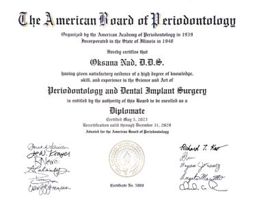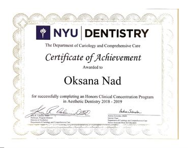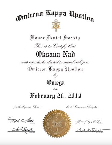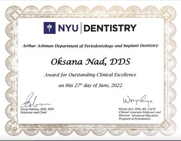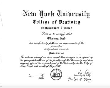 Dr. Oksana Nad received her D.D.S. from the New York University, College of Dentistry in 2019, graduating with honors in Aesthetic Dentistry and was inducted into the Omicron Kappa Upsilon National Dental Honor Society in 2019. Dr. Nad continued her post doctorate training in Periodontics & Implant Surgery at NYU College of Dentistry and graduated with an award in Outstanding Clinical Excellence. She is a Diplomate of the American Academy of Periodontology and Board Certified in Periodontology and Dental Implant Surgery. This is a prestigious certification awarded after rigorous examination by the American Board of Periodontology.
